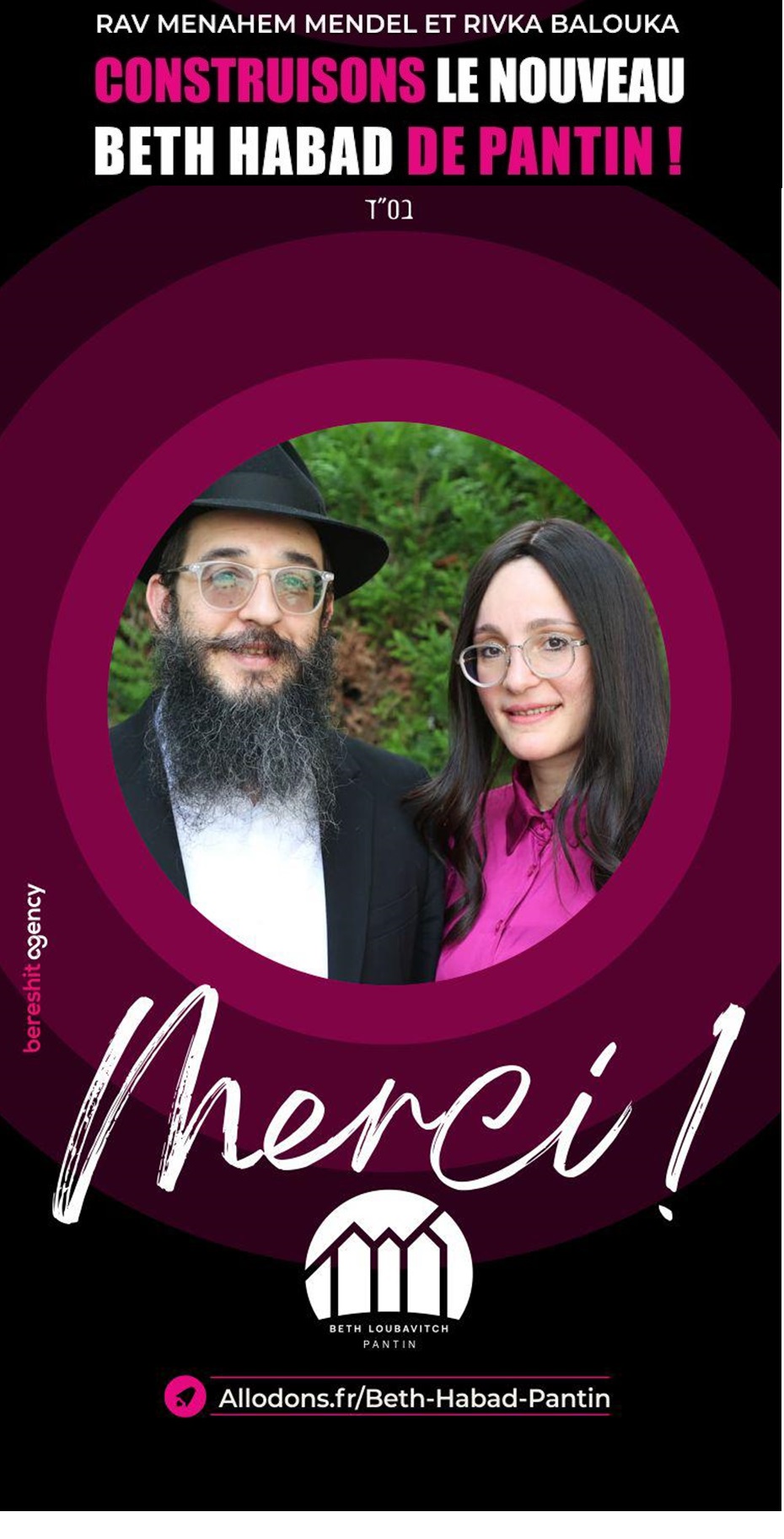 Nous vous remercions chaleureusement, toutes et tous de nous accompagner dans NOTRE PROJET d'agrandissement du Beth Habad. Votre participation, au niveau de vos dons, de votre temps passé à nos côtés, de votre investissement personnel et familiale ainsi que de vos encouragements renforce notre enthousiasme à continuer, avec encore plus de vigueur, à nous efforcer de tisser ces liens fraternels qui nous lient.