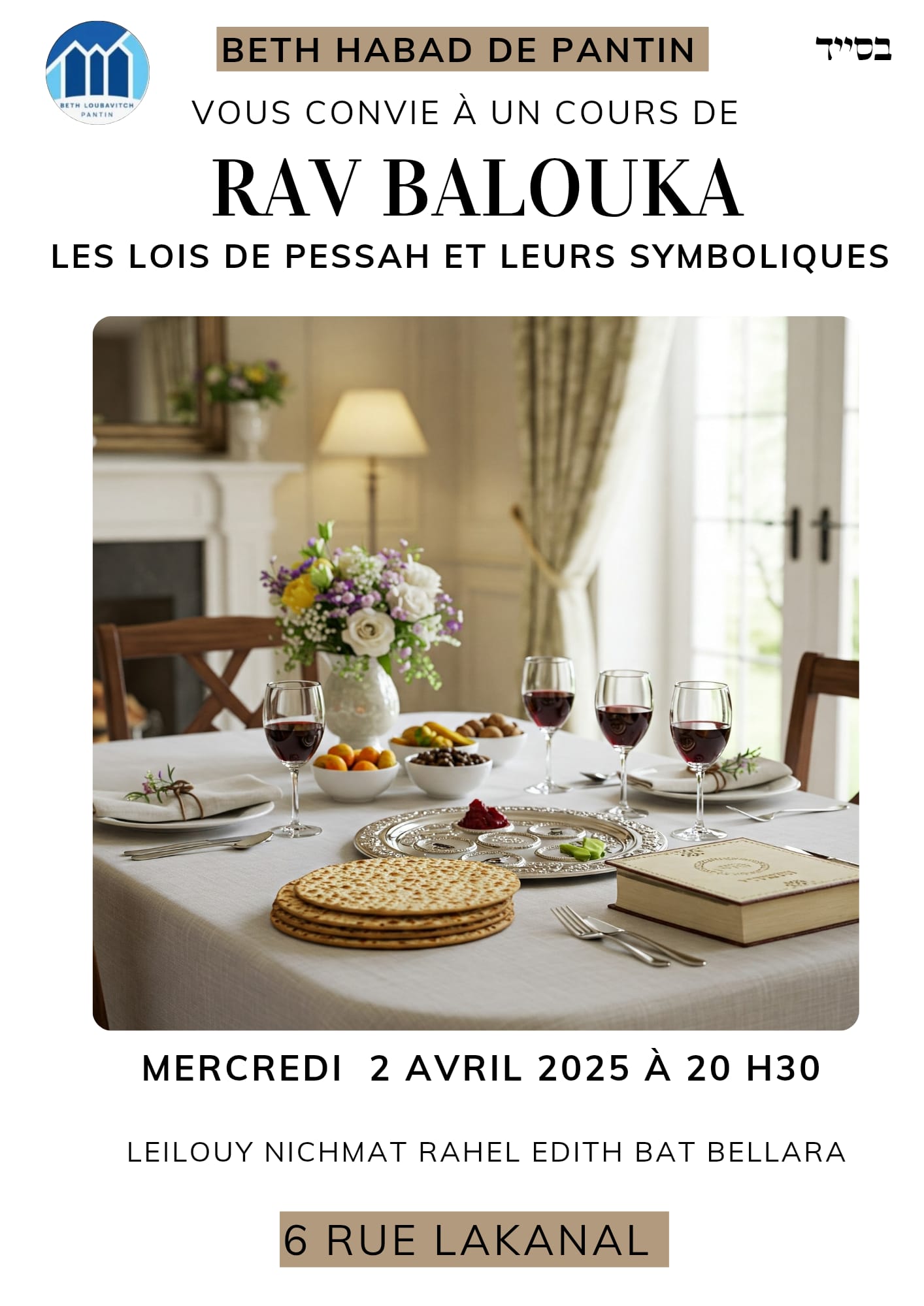 Rav Mendel Balouka vous invitons chaque jeudi à partir de 20h30 à participer à un cours hebdomadaire de Hassidout